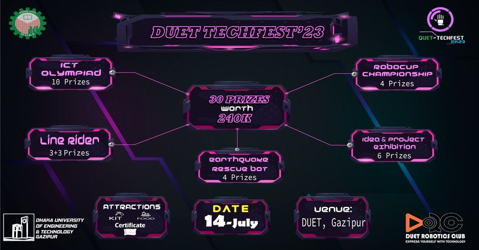 DUET TECHFEST 2K23 is a tech festival organized by DUET Robotics Club with Dhaka University of Engineering and Technology. This is the 4th edition of DUET TECHFEST and it will be one of the biggest tech festivals in Bangladesh. The theme of this year's festival is "Grant festival for technology enthusiasts".