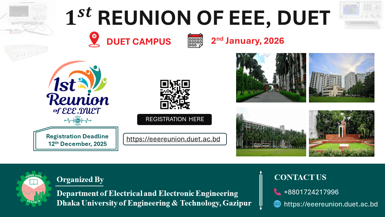 The 1st Reunion of EEE, DUET, to be held on 2nd January 2026 at DUET, is more than an event—it is a homecoming. It offers a special opportunity to reconnect with friends, revisit cherished memories, and celebrate the shared spirit that unites generations of EEE graduates. This gathering serves as a meaningful platform for exchanging experiences, inspiring young engineers, and strengthening the bond that ties our alumni family together.