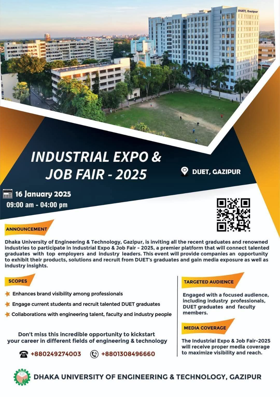 Dhaka University of Engineering & Technology, Gazipur, is inviting all the recent graduates and renowned industry to participate in Industrial Expo & Job Fair - 2025, a premier platform that will connect talented graduates with top employers and industry leaders. This event will provide companies an opportunity to exhibit their products, solutions and recruit from DUET’s graduates and gain media exposure as well as industry insights.